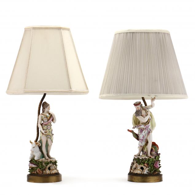 Zeus lacking trident, chip to dolphin's tail; Europa lacking element in left hand, break to one in right hand; both with leaf breaks and loss; missing one finial. with non-matching shades; dust accumulation.