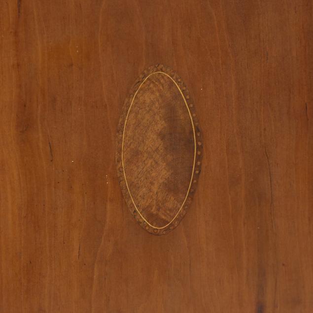 Upper three shelves are original but have been lowered and reset to align with the horizontal mullions; cut and patch to upper right door lower corner by hinge; some later glazing and glass; two veneer chips/loss to cornice frieze; shrinkage crack at cove molding; small six inch cut and patch to upper right corner of cornice; lower left cabinet door with small cut and patch by hinge; skirt appears original; however, the foot facings have been cut and appear later.
