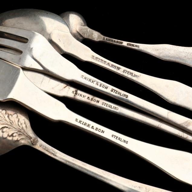 Lady Mary bouillion spoons (5 in.) and (1) demitasse spoon (4 1/4), all with "B" monogram; set of four demitasse spoons by Wallace Silversmiths, no monograms; set of four demitasse spoons by R. Wallace & Sons Mfg. Co.,all with "S" monogram; bouillion spoon, unmarked save sterling, H monogram; Frank Smith Silver Co. teaspoon, no monogram; two sterling handled carving knives and one carving fork, no monograms; sterling handled pie server, no monongram.
