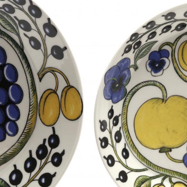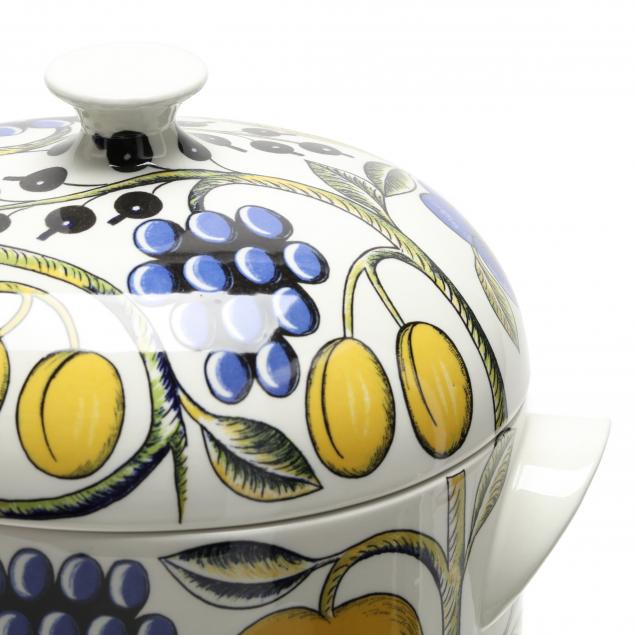 Blue flowers and fruiting vines on a white field, to include: (6) dinner plates (10 in.); (14) salad plates (8 1/8 in.); (6) oval and (3) round cereal / soup bowls; (3) oval luncheon plates; (2) oval dinner plates (10 in.); (12) saucers; (6) flat cups; a covered storage jar (HOA 8 1/2 in. and a platter (14 in.).