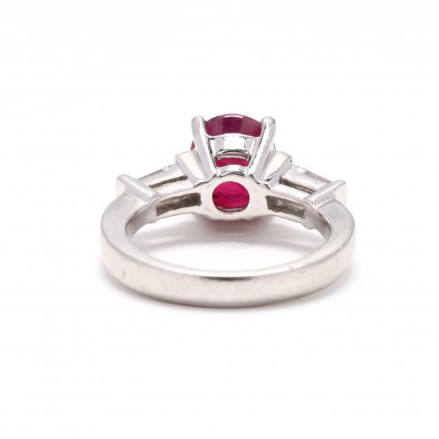Centered on a prong set oval brilliant cut ruby (9.46 x 7.69 x 3.97 mm) weighing approximately 2.24 carats and set to each side with a tapered baguette diamond weighing approximately .42 total carat (G-H color, VS clarity), signed and marked Plat, numbered 20028.