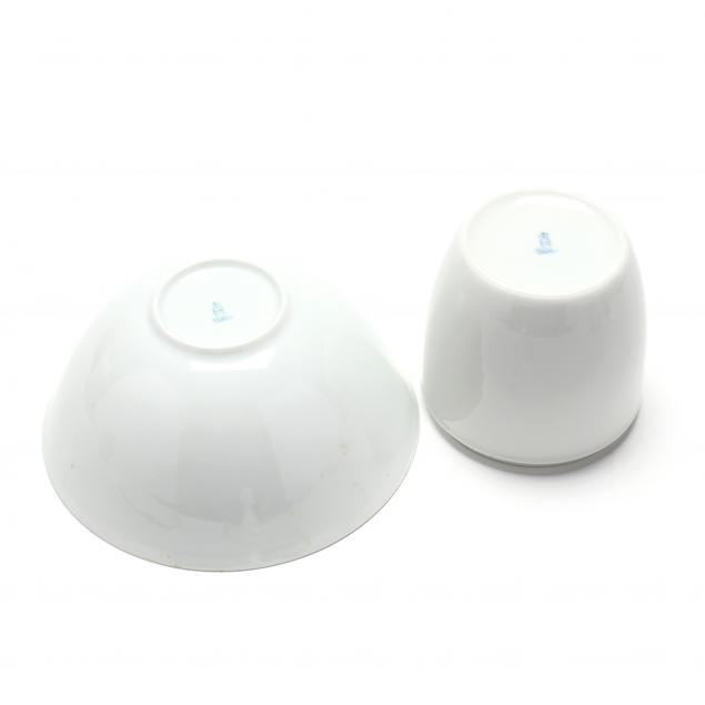20th century, designed in the 1930s with four different finials, glazed white porcelain, the set includes a covered coffee (DOA 7 3/4 x 8 3/4 in.), a covered teapot, a covered biscuit jar (6 3/4 in.), a covered sugar and a covered bowl; an open creamer, (12) cups, (6) saucers. Blue shield mark and "WIEN" back stamp.