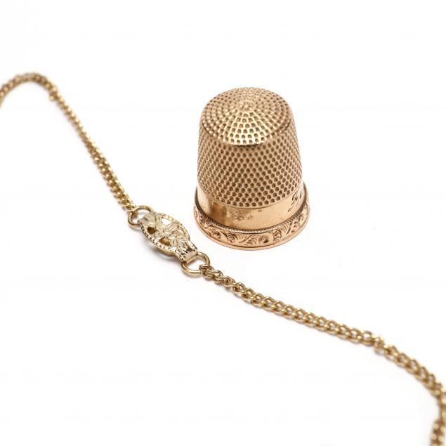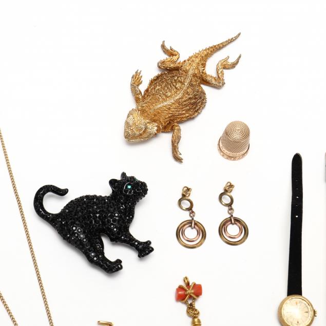 Including a Luxor 18K gold wrist watch with interchangeable leather bands, marked; an 18K gold pendant with Saudi Arabian emblem, marked; a Victorian 10K gold thimble engraved Fielding, marked; an 185? 1 Dollar gold coin (test for 18K+); a yellow metal cast horny toad brooch; a pair of two tone screw back earrings; three coral pendants; one gold tone chain with small cross and pearl pendant; and a Swarovski crystal and black enamel metal brooch, marked.