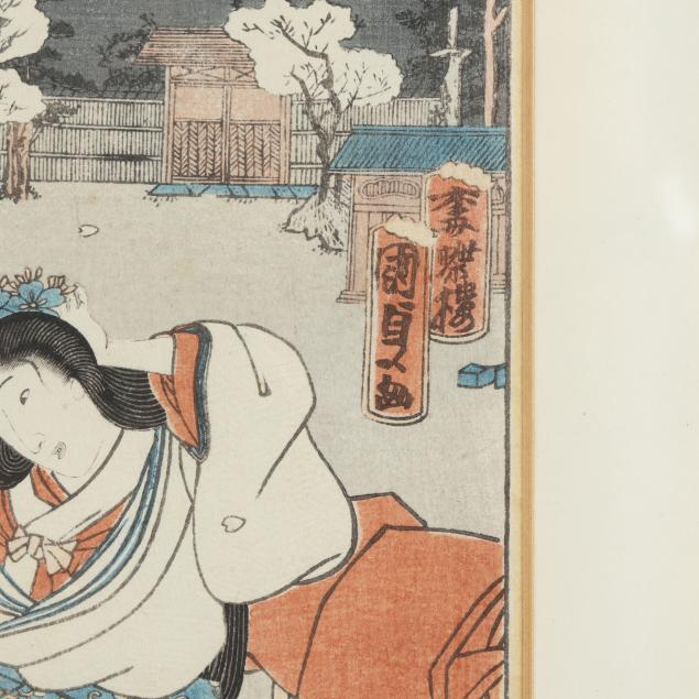 Genjimon and inscription at top corner, deluxe printing with embossing to robes on both, signed in red cartouches, publisher seal and censor and date seals to each, identically framed with mat, not examined outside of the frame.