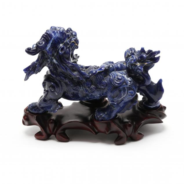 Marbled lapis lazuli carved into an energetic and mythical lion with single curling horn to its head, open mouth, mane and long curls all over body and tail, with a small baby lion hanging onto back of body near hind leg, secured into a carved wooden base.