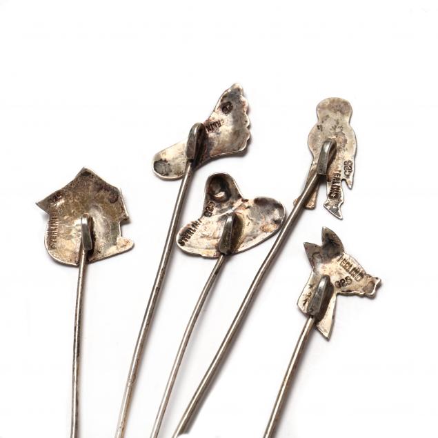 To include: the first a round silver dish by Richard Dimes Co., model number 468 (1 x 6 3/4 in.) (some scattered scratches); the second a small handled mug by Towle, model number 773 (2 x 2 1/2 in.) (small dent to base, light scratches) ; third a group of (12) two prong hors d'oeuvre picks with festive object and figural tips, including two with twist stems, the others with straight stems. All without monograms.