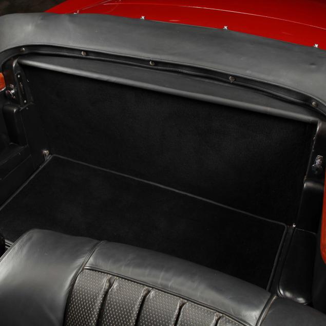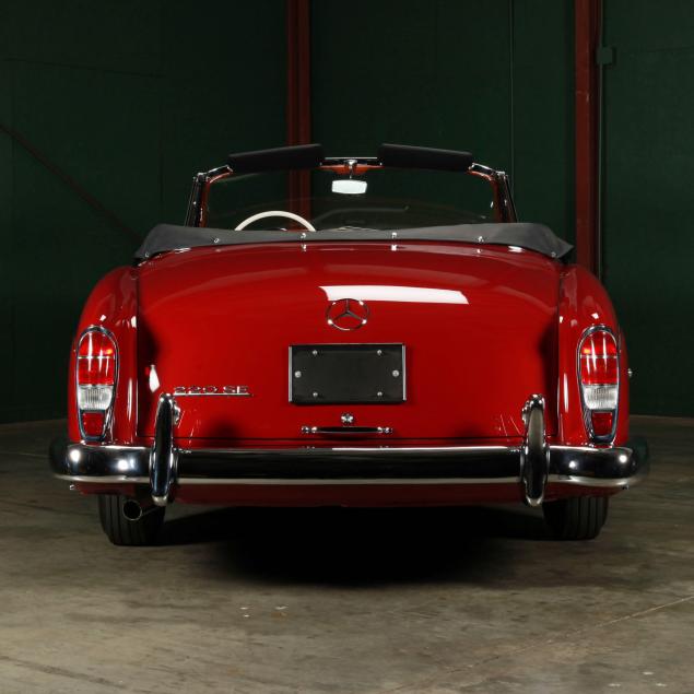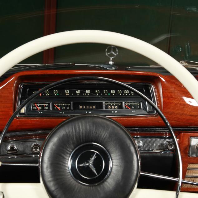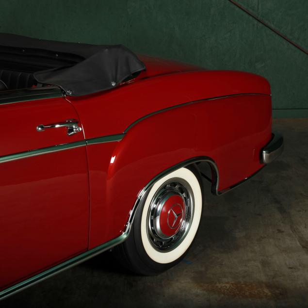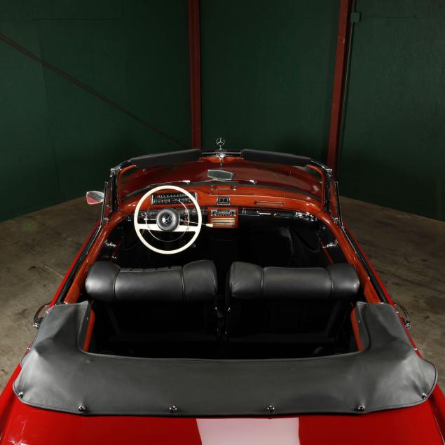 The car's 2.2-liter in-line 6 cylinder engine produces 115 horsepower, and is driven by a column-mounted 4-speed manual transmission. In its original interior/exterior of DB 516 Mittelrot (medium red) with 953 black leather interior and black German canvas convertible top. The dash, door caps and other parts of the interior are gorgeous, hand crafted woodwork. Seats and interior trim were crafted in superior Roser surface-dyed leather hides, with Wilton wool carpets and chrome details. Becker Grand Prix AM/FM radio in the dash. A copy of the original data card is included.