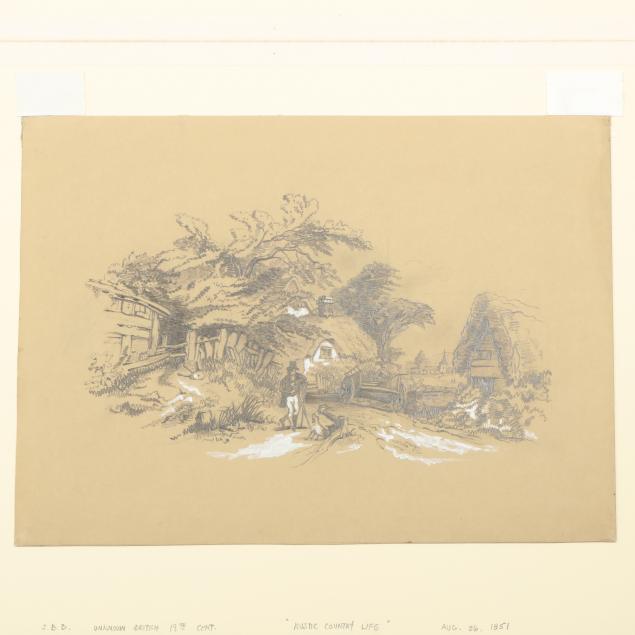 Early to late 19th century, the first a cottage scene with chickens, titled "Hitcham, Near Taplow," by Ellen Annie Bowler (d.1891), signed and dated lower right, interior matting with brief artist biography and old exhibition placard (sight size 6 5/8 x 9 5/8 in., mat size 12 1/2 15 3/8 in.); the second of an outdoor wedding scene, watercolor and ink on paper, by Gertrude Angela Kingston (1862-1937), depicting an outdoor wedding scene, signed monogram to lower right, with artist biography mounted to interior mat (sight size 8 x 6 3/4 in., mat dimensions 13 5/8 x 12 3/8 in.); the third a drawing of a cottage, pencil and white heightening on paper, signed J. B. B. to lower right, the title "Rustic Country Life" inscribed to mat, the drawing verso dated Aug 26, 1851 (sight size 7 x 10 1/2 in.; mat size 12 1/4 x 15 1/2 in.); two works depicting a pastoral scene, both ink wash on paper, both appear unsigned (sight size 6 3/8 x 8 1/4 in.; mat size 11 1/4 x 13 in.); the sixth of a riverside view of a church, pencil with watercolor and gouache, appears unsigned (sight size 6 x 9 1/8 in.; mat size 11 1/4 x 14 1/4 in.); the seventh a view of Dieppe, France by Mary Hilton Burrup, pen and ink on two sketchbook leaves, the recto singed and dated Dieppe / July 30th 1878?, the verso with inscriptions (sight size 4 1/4 x 8 in.; mat size 9 x 13 1/4 in.); the eighth a hillside view of Greenwich Park, circa 1880, watercolor on paper, inscribed to recto, appears unsigned. (sight size 6 3/4 x 10 in.; mat size 15 1/4 x 11 7/8 in.); the ninth a view of an country estate by Henry Brabazon Urmston (1828-1869), signed and dated 1863 to lower right (sight size 6 3/8 x 9 3/8 in.; mat size 12 1/4 x 15 in.); the tenth a study of a rocky shoreline, watercolor with pencil on paper, unsigned, (sight size 4 1/4 x 7 1/8 in.; mat size 9 1/4 x 11 7/8 in.).