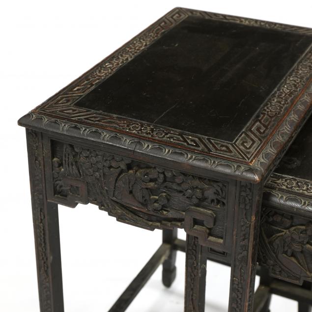 First half 20th century, rectangular form, each with relief carved edge and legs, the smallest table with a single flush drawer.