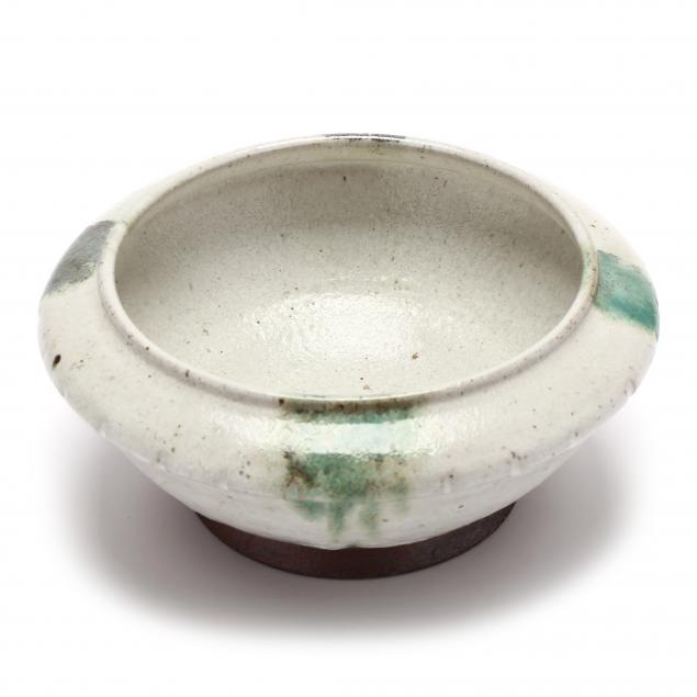 Chinese White glaze with spaced contrast splashes, unglazed base area, underside stamp "BEN OWEN POTTERY SHOP".