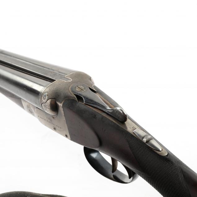 Serial number 61434 on barrels, water table and forend; 26 in. barrels, the nickel-plated receiver marked THE KNOCK-ABOUT GUN and VON LENGERKE & DETMOLD NEW YORK; checkered walnut stock; re-blued trigger guard, hard rubber butt plate, length of pull 13-1/4 in. Will require FFL transfer. Guns are only delivered to a local FFL dealer every Wednesday.