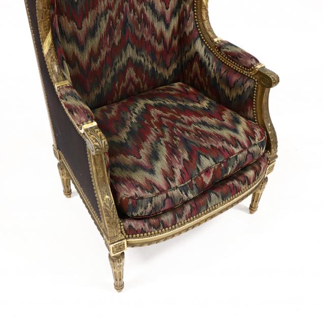 Early 20th century, wood and composition frame with laurel leaf and berry motif, flame stitch upholstery, loose cushion, stop fluted legs.