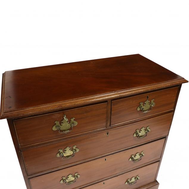 19th century, pine secondary, top with applied molded edge, the case with two over three graduated cock beaded drawers on shaped bracket feet.