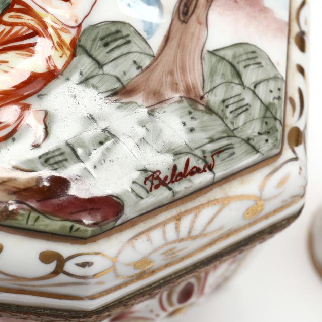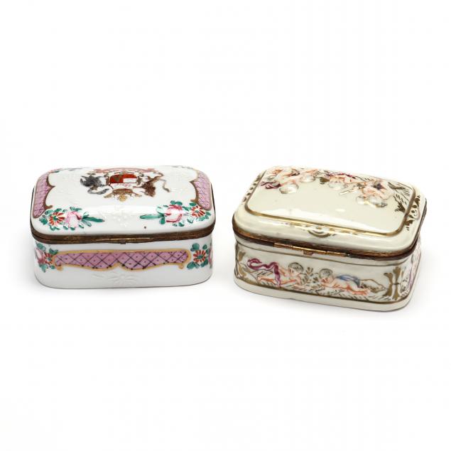 Late 19th century, two in the style of Capodimonte, gilt brass bound with bas relief classical scenes on the covers (larger 3 1/2 x 8 x 5 in.); two with armorial decoration, one attributed to Samson (3 1/2 x 2 3/4 in.); an Apogee Limoges shaped box; an unmarked box decorated with cupids (losses to gilt) (5 3/4 in.wide).