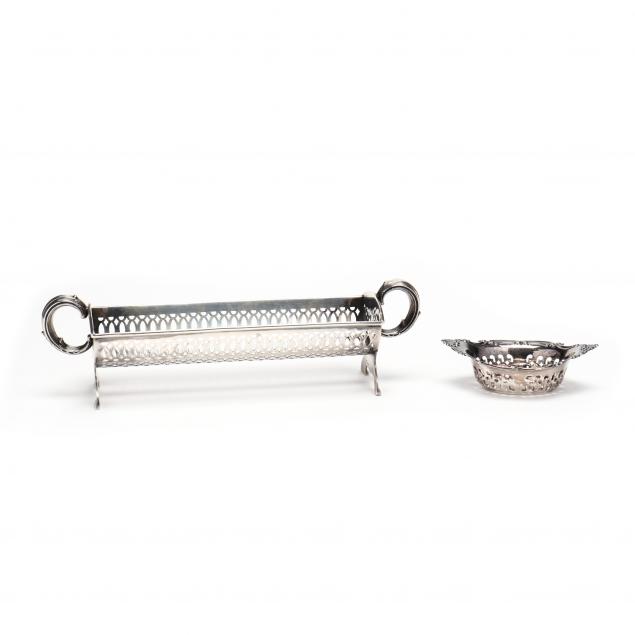 The larger a cracker tray by La Pierre, pattern number 421, cylindrical form, with curved reticulated curvilinear designs, foliate scroll handles, raised in arched feet (2 3/4 x 9 x 2 1/2 in.); the smaller a nut dish by Gorham, pattern number 4780/3 (1 1/4 x 3 7/8 x 2 1/2 in.). No monograms.