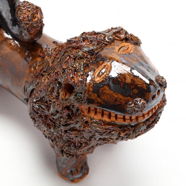 Clear lead glazed earthenware with applied slip, curly clay mane and pom-pom, two rows of teeth left unglazed, inscribed on the underside, "BH 54"