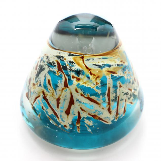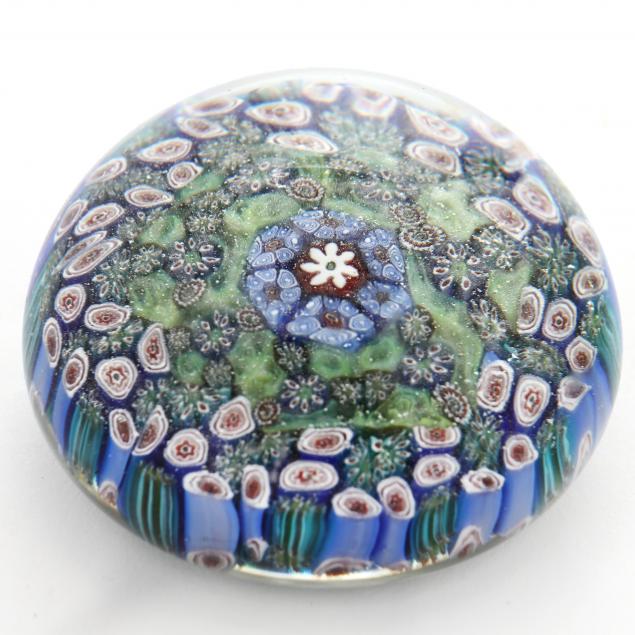 20th century, to include: one Perthshire millefiori round form with saw tooth edges, signed "P" to cane (1 x 2 1/2 in.) (some small chips to edges); ovoid form with case green white and blue designs with millefiori rosettes, unsigned (2 x 3 in.); small ovoid form, with red, green, and blue millefiori designs (1 1/2 x 2 1/8 in.); egg shaped form with millefiori and air trap bubble designs, with figural signature to cane (3 x 2 5/8 in.); conical form with red white free form designs over a blue-green mound, signed illegibly to underside (3 1/8 x 3 in.).