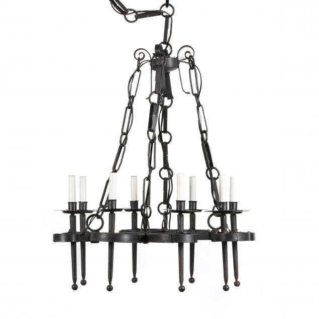 Mid 20th century, eight light form, black painted iron with chain supports and scrolled arms.