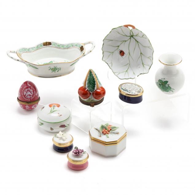 To include: (2) Herend trinket boxes. a Herend miniature vase, and a Herend handled tray (1 3/4 x 6 3/8 in.); (5) pill boxes and a leaf shaped dish with ladybug (1/2 x 4 in.)