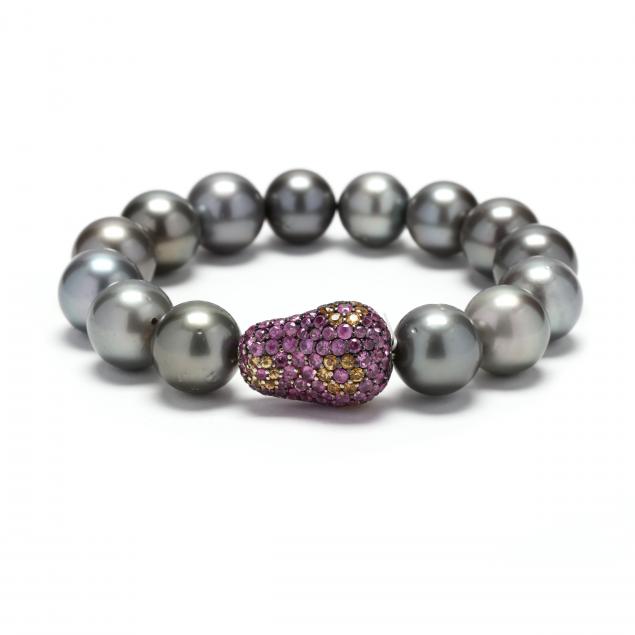 Bracelet strung on an expandable stretch cord with (14) gray cultured pearls (10.5mm - 11.9mm) and with a pear shaped gem-set bead pavè set with likely pink and yellow sapphires, unmarked.