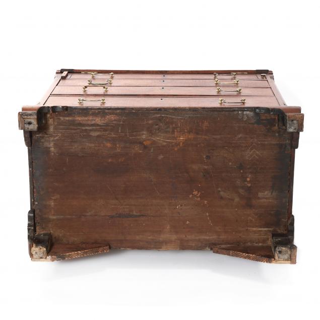 Inlaid escutcheons likely later; the top: some louvered shelves and dividers later; upper case lower left and right rear corners with cut and patch, minor loss; the desk: hinged lid with loss to corners; left upper corner with cut and patch; later hinges with cut and patch; old dark staining to writing surface; later drawer guides; some drawer runners rebuilt; pulls later with concealed plug; left front and rear foot with hairline crack and repair to facing.