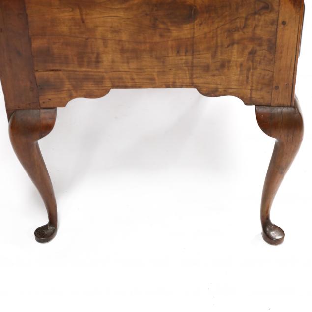 Circa 1760, white pine secondary, rectangular molded top, single lipped long drawer above two small lipped drawers, shaped skirt with incised line, drop finials, flush side panels, cabriole legs with pad foot.
