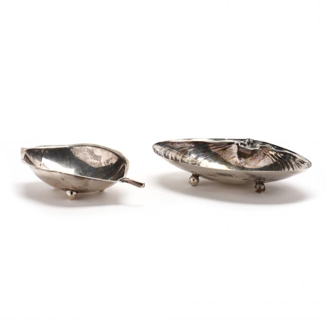 The leaf dish by Alfredo Sciarrotta, retailer mark of Bailey, Banks & Biddle Co., pattern number 4, no monogram (1 1/4 x 5 3/8 x 3 1/4 in.); the shell dish by Wallace, pattern number 4094, naturalistic clam form. Both with ball feet, no monograms.