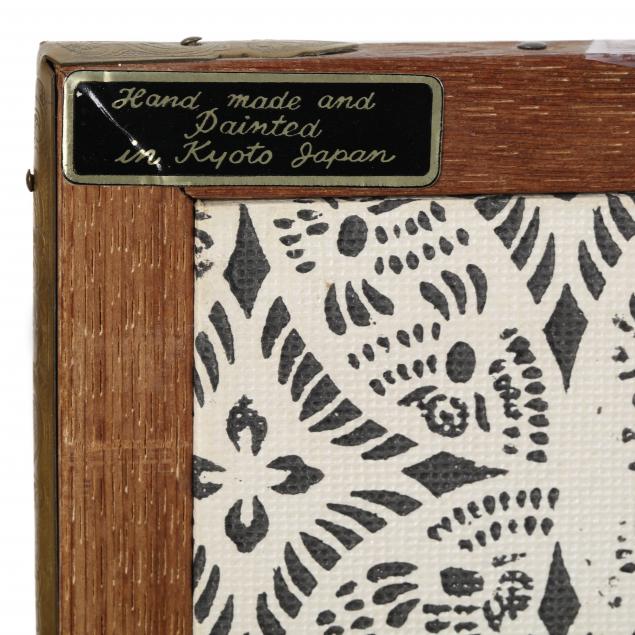 Vintage, watercolors and metallic gold on paper with brocade border and wooden frame, a market scene with elongated foreign figures selling goods, cherry blossoms bloom above, plaque with "Handmade and painted in Kyoto, Japan" to reverse corner.