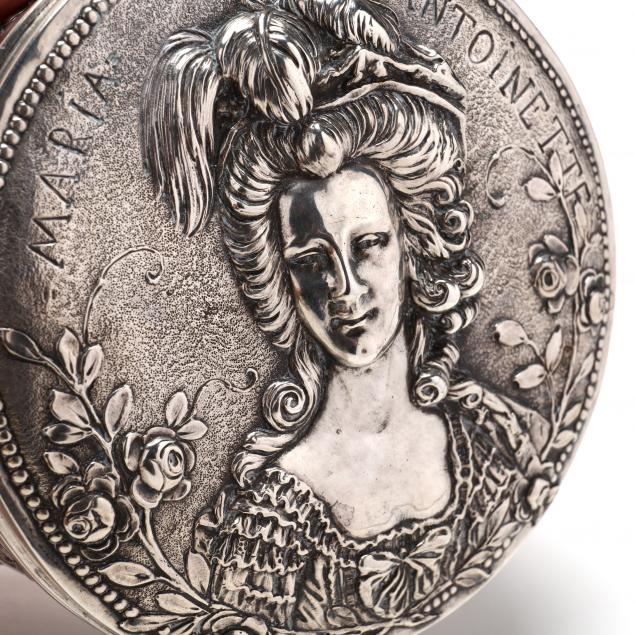 Circa 1900, mark of Georg Roth & Co. of Hanau, .800 silver, circular form with hinged cover featuring the portraits of Marie Antoinette and Louis XVI, gilt interiors, with garland of flowers to each side.