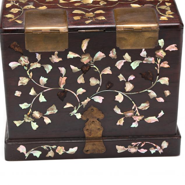 Private Collection, Durham, North Carolina Warp to lid; some inlay loss; missing side bail handles.
