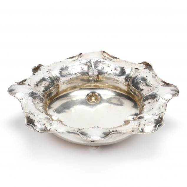 950/1000 fine silver, hallmarked, engraved "L / 1902" to underside, hand-raised circular form with an undulating everted rim featuring hand-chased delicate floral and foliate decoration against a faint hand-hammered ground, the well features four integrated feet.