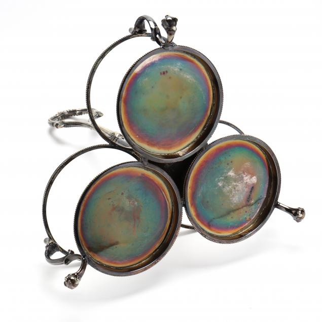 Late 19th century, mark of Henry Wilkinson, pattern number 525, three graduated uniform cut crystal decanters with spire stoppers, set within a conforming trefoil silverplate stand with shaped ring handle finial center, three scrolling legs on ball and paw feet.