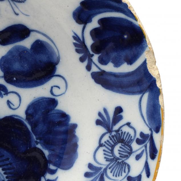 18th century, to include: a large deep plate (1 1/2 x 11 3/4 in.); a floral plate with no border (rim chips); ; a plate decorated with fruit and ferns within a decagon (9 in.) (rim chips); a bird and floral urn decorated plate (2 1/4 in. rim chip and smaller nicks); a signed "APK" with a garden scene (edge chips and fill) (9 in.)