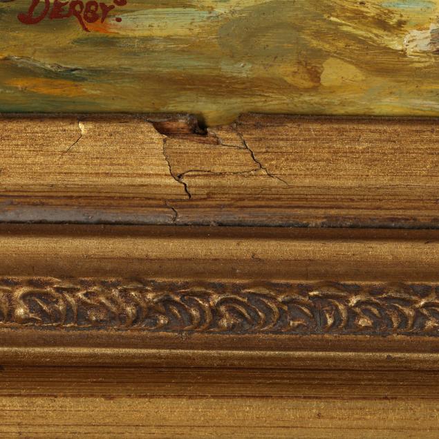 Oil on panel, bears signature and inscription at lower left reading "Geo. Paice / Warburton Hall / Derby," presented in a gilt frame with faux antique label.