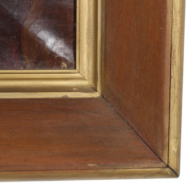 Oil on canvas (lined), appears unsigned, presented in a recessed wood frame with gilt fillet.