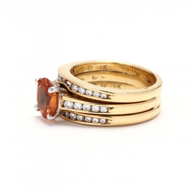 Centering on a prong set oval cut spessartite garnet (7.7 x 6.8 x 3.17 mm) weighing approximately 1.30 carats set on triple band soldered together and with channel set full cut round diamonds weighing approximately .36 total carat (G-H color, VS-SI clarity), each band stamped 18K and with a maker's mark.