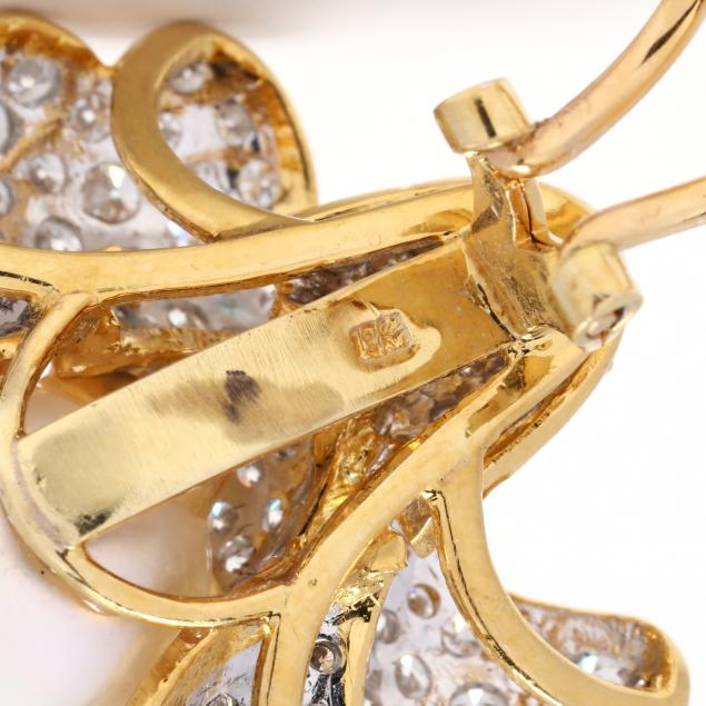In a floral motif set with full cut round diamonds weighing approximately 4.54 total carats (F-G color, VS clarity) bead set in white gold within a yellow gold frame, centered with a baroque South Sea pearl (13mm average), completed with omega clip backs, stamped 750.