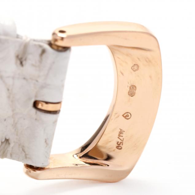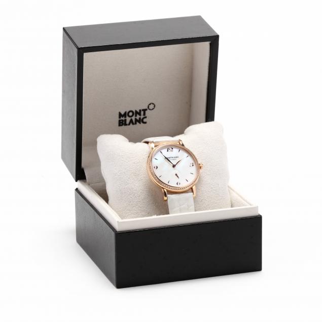 Automatic with twenty-seven jewels, the round rose gold case bezel set with full cut round diamonds, the mother-of-pearl dial with rose gold Arabic and point hour markers, with rose gold tone hands and subsidiary seconds dial, completed with a grained white leather strap band and gold buckle stamped 750 and with Swiss hallmark, movement numbered 4810 408 / 27 jewels, signed and marked Meisterstück, with skeletal case back stamped Au750 / 7240 PL891509. Total diamond weight approximately .72 total carat (F-G color, VS clarity).