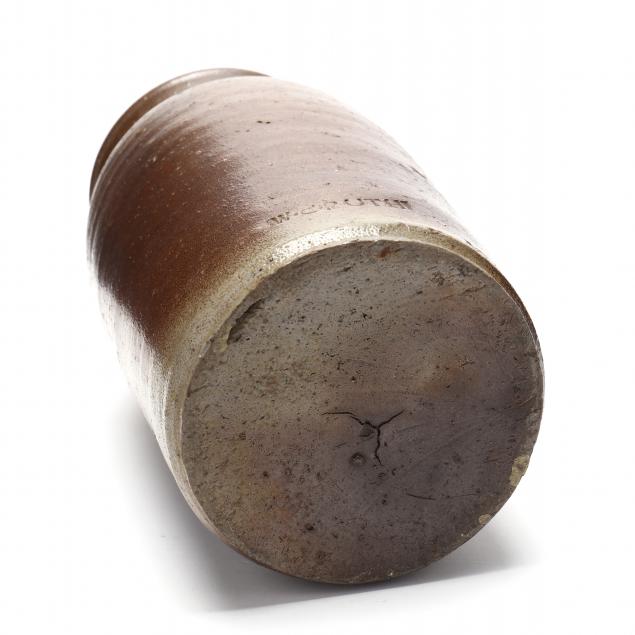 Salt glazed stoneware, having a high collar with inner rim, straight sided vessel, the stamp "WC RUTH" one inch above the base.