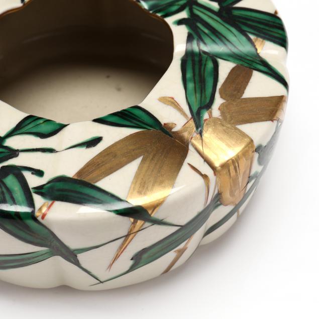 20th century, octagonal lobed shaped vase with wide overlaying rim hand painted with gilt and vivid green bamboo leaves against a cream crackled ground, signed to the underside in iron red.