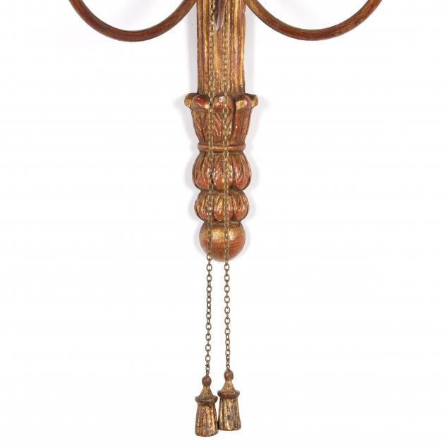 Late 20th century, carved and gilt wood, metal chain with carved tassels, scrolled metal arms, appears unmarked.