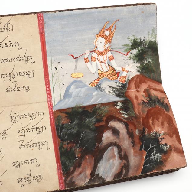 19th century, ink and watercolor with gilt highlights on accordion folding pages, with 18 vivid illustrations flanking hand written text, 100 pages total, between two lacquered covers, this manuscript recounts the classic Thai Theravada Buddhist text of the monk Malai, on his journey to hell and heaven, the popular story serves as a moralizing tale in which the consequences of one’s deeds in this life impact on one’s fate in the next.