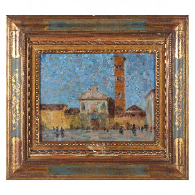 Oil on board, inscribed "Eug. Vail" to verso, presented within a Florentine style frame.