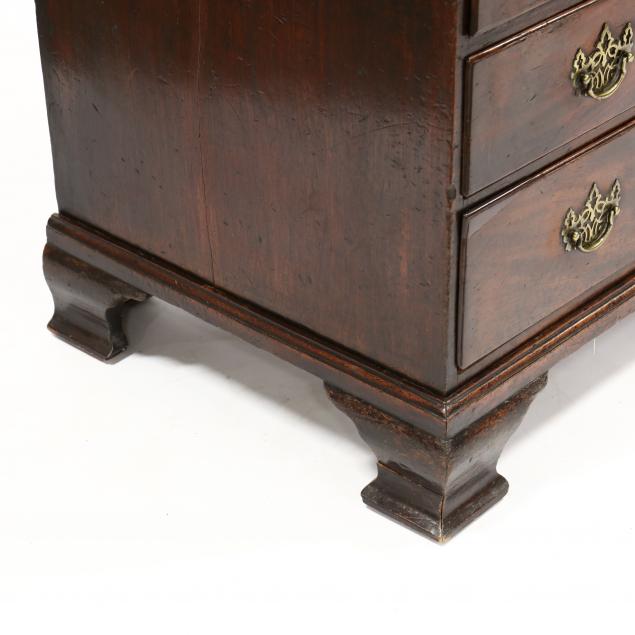 Later cornice and pediment; feet tipped lower two inches; break and repair at lid by escutcheon; dark staining, denting and wear to writing surface; several drawers with cut/patch lip repair; surface mold present.