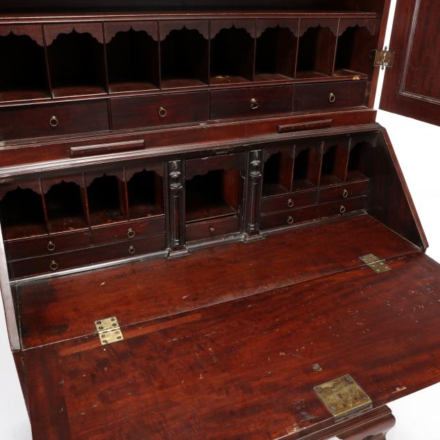 Attributed to Massachusetts, circa 1770-1780, two part form, white pine secondary, the upper dovetailed case with an applied cornice having a stylized dentil molding above a thin plain frieze, two hinged paneled cabinet doors with relief carved shaped border, interior with two louvered shelves above eight valanced pigeon holes above four side-by-side small drawers, two pull-out candle slides, the dovetailed desk with a hinged slant lid with molded edge and bread board ends, loper support, interior with two applied columnar document drawers, eight valanced pigeon holes, six small drawers, missing prospect door, four graduated flush long drawers raised on bold ogee bracket feet with spurs, central shaped drop pendant.