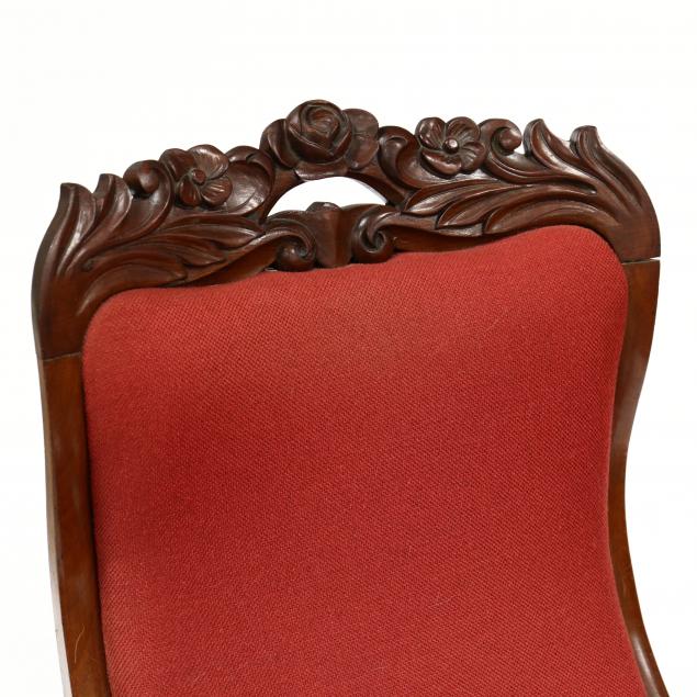 Mid 19th century, relief carved crest with foliate and leaf design, scrolled and pierced arm supports, serpentine front rail with ribbon molding at bottom edge, rockers with shaped front and rear tips.