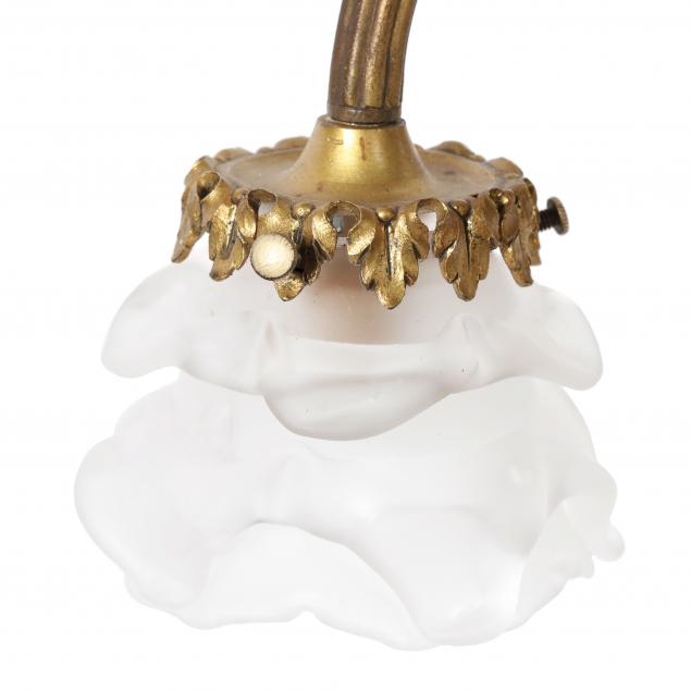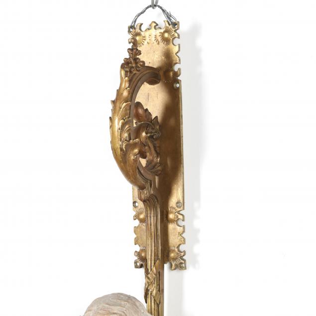 Early 20th century, scroll and acanthus leaf form three-light sconces with terra-cotta mounted figures, with frosted glass flame shades, appears unmarked.