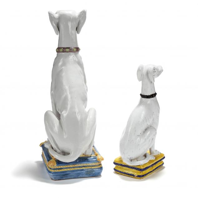 Mid to late 20th century, the larger in a white glaze with a studded green and purple collar resting on a blue and yellow tassel pillow (44 x 15 x 20 in.); the smaller in white glaze with a dark brown studded collar on a blue and yellow pillow, appears unmarked (28 x 10 x 14 in.).