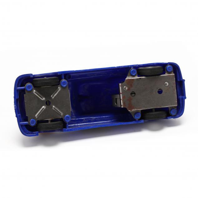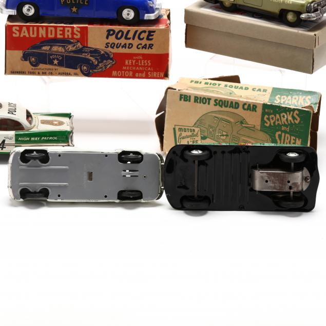A Saunders "Police Squad Car" plastic friction toy circa 1950 with box (good condition; box end tab missing); Japan tin litho friction "Moving Gun Police Car" with box (car 6 3/4 in.) (bumpers tarnished); a highway patrol car (fair condition); "Military Police" made in Germany, tin litho friction car (bent antenna otherwise good); Courtland tin litho "FBI Riot Squad Car" with box (rust to roof; box torn in fair condition) (box 2 3/4 x 7 3/4 x 2 1/2 in.).