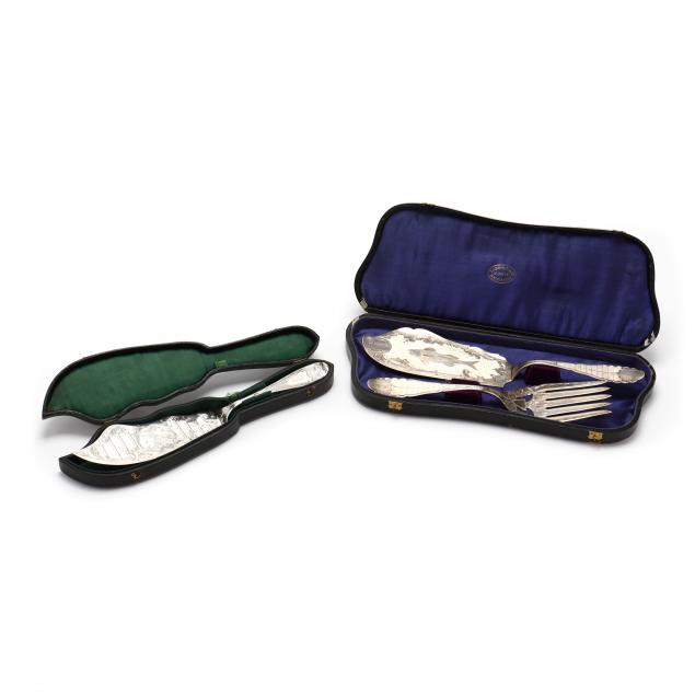 Mid 19th century, both sets with retailer mark mark of Larmour & Co. of Baltimore, presented within the original conforming satin lined cases, the first an ice cream slice, mark of Peter G. Perdriaux of Philadelphia, the blade with engraved and chased shoreline cottage design within scroll cartouche (knife 11 1/4 in., case 11 7/ 8 in.); the second a fish knife and fork set, mark of James Watts of Philadelphia, knife with engraved fish, scrollwork, and geometric patterning (knife 12 in., case 13 1/4 in.). All monogrammed "Baker" to handle.